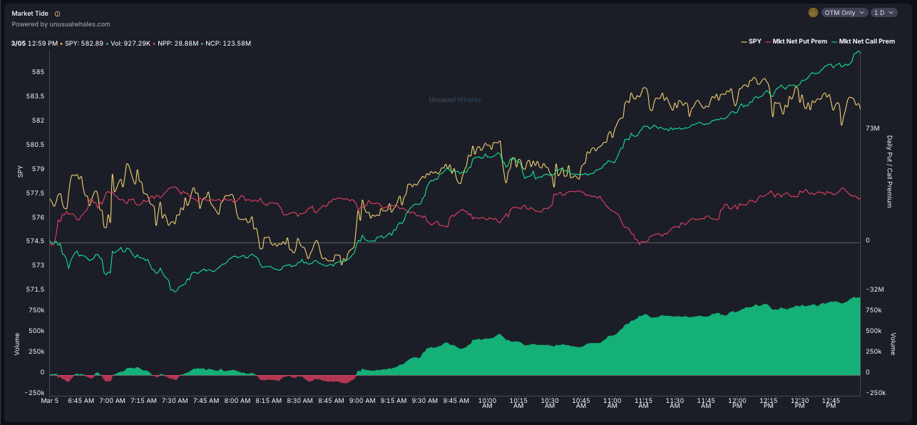 🔥 Key Observation: Today, net out-of-the-money (OTM) call and put premium BOTH surged while SPY climbed from 573.50 at open to a peak of 584.13, closing near 582.89.