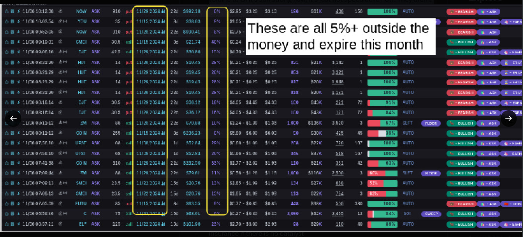 5% OTM contract w/ >.7 vol/OI ratio: volume needing to be greater than OI isn't true, so long as it's not your only metric. Significant inflow into an OTM contract is still a clue.