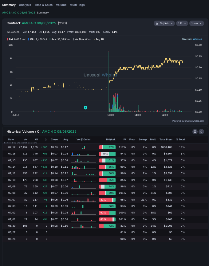 This is not your usual low-strike YOLO. Today’s flood of volume (more than 70x daily norm) suggests aggressive speculative flow. This was not a slow build — the bids exploded in one vertical move midday and consolidated above $0.20. The clear gamma ramp and tight expiry make this a likely candidate for a “call wall test” or even a gamma squeeze setup if AMC trades into $3.80–$4.10 in the next few days.