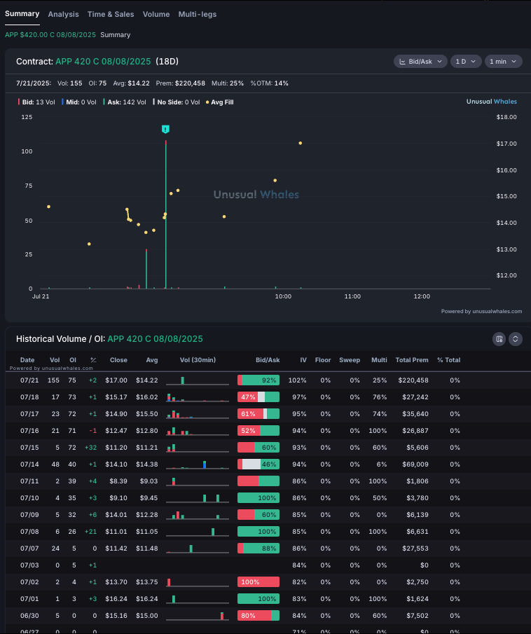 Commentary: Unusual sweep cluster near $14–$15 avg fills with a wide IV push. Despite low OI, the strike/expiry combo suggests a speculative momentum bet, possibly earnings-adjacent or piggybacking on broader tech surge. Volume today is largest in 3 weeks.