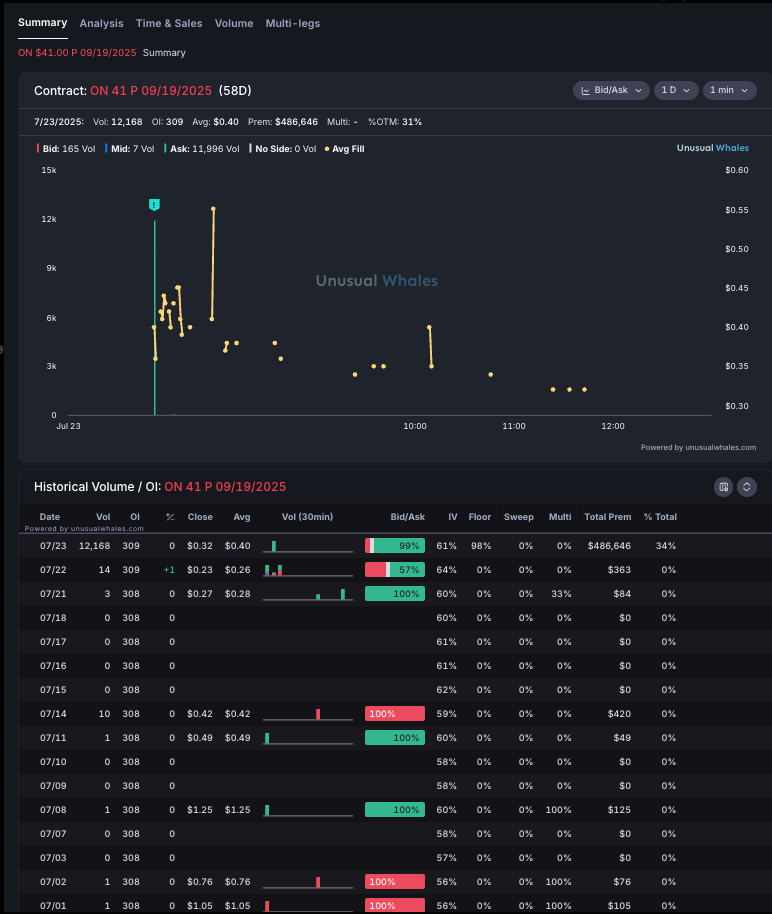 The massive volume surge on 7/23 with low prior OI implies a fresh bearish bet.