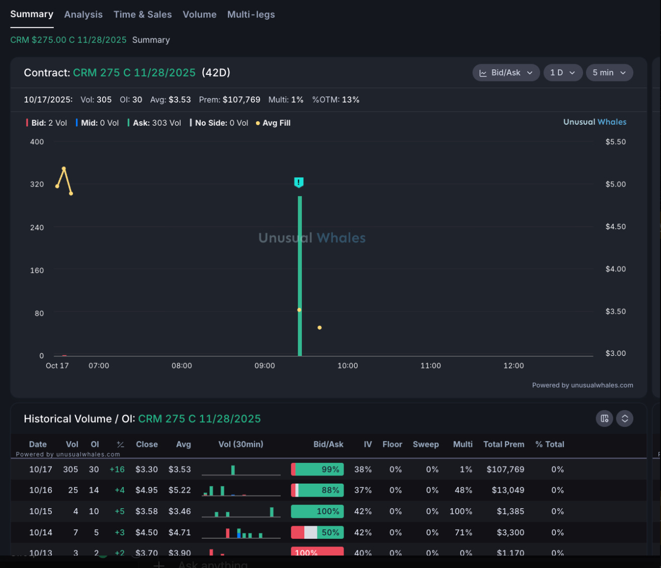 Big spike in CRM call buying, outpacing open interest, suggesting new positioning. The $275 strike aligns just above a soft resistance zone — whales likely targeting post-earnings continuation strength into late November. That 99% ask-side fill tells us this wasn’t passive — it was aggressive conviction flow.