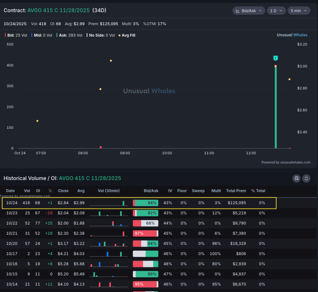 🎯 AVGO 415C 11/28/25 — $125K premium, just before close. Nice tight risk profile, 17% OTM.