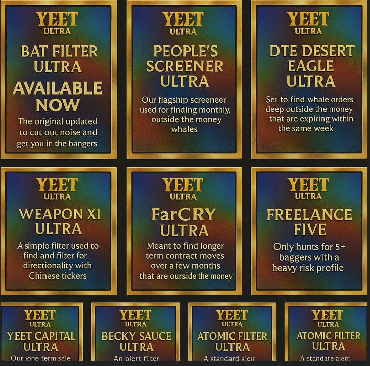 👀 Over the next two months, every existing YEET filter — the ones we’ve used, refined, and abused since the dawn of flowtime — is getting a full Ultra upgrade. Cleaner logic, tighter signal-to-noise, stronger conviction. Some would say too clean for the price.