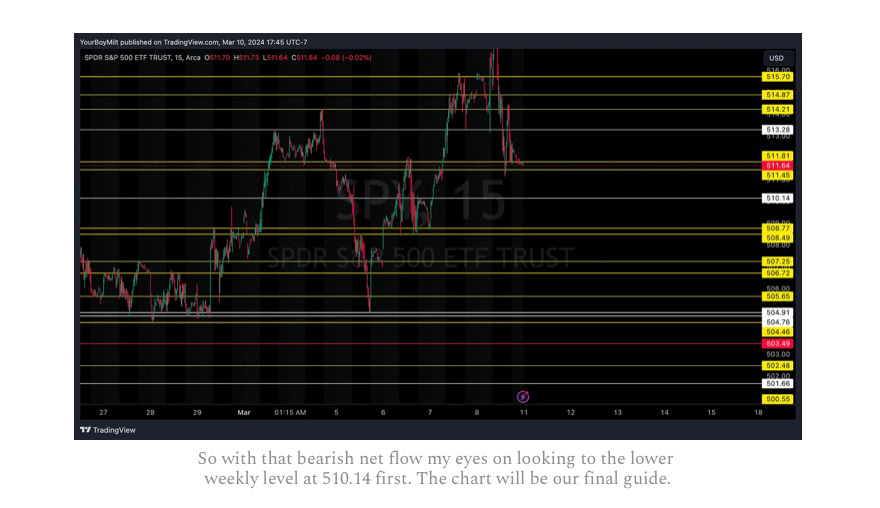 A) Caution on play entry: a good example of this was last week; the market saw two big green days while net flow continued to diverge, increasingly bearish. So on individual tickers Iâm not buying pops, and instead waiting for key price action breaks to the downside on good opportunities.