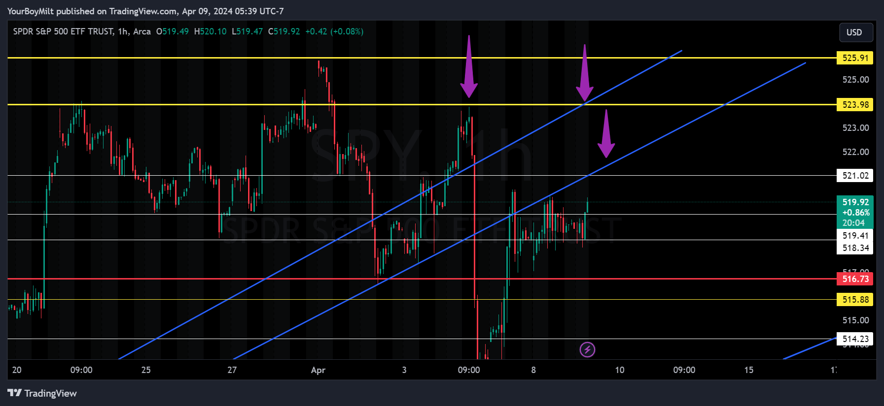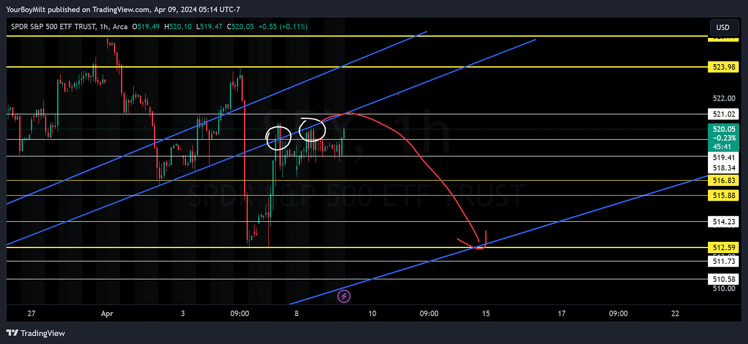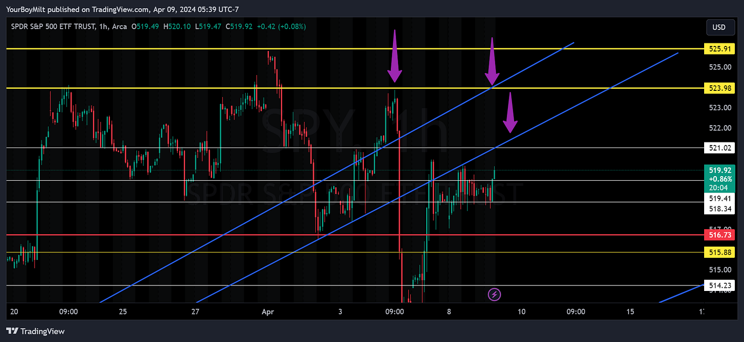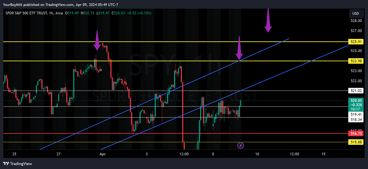 SPY 520p at a rejection of the upper trend, 524, 524.7, or 525.98 (previous high).