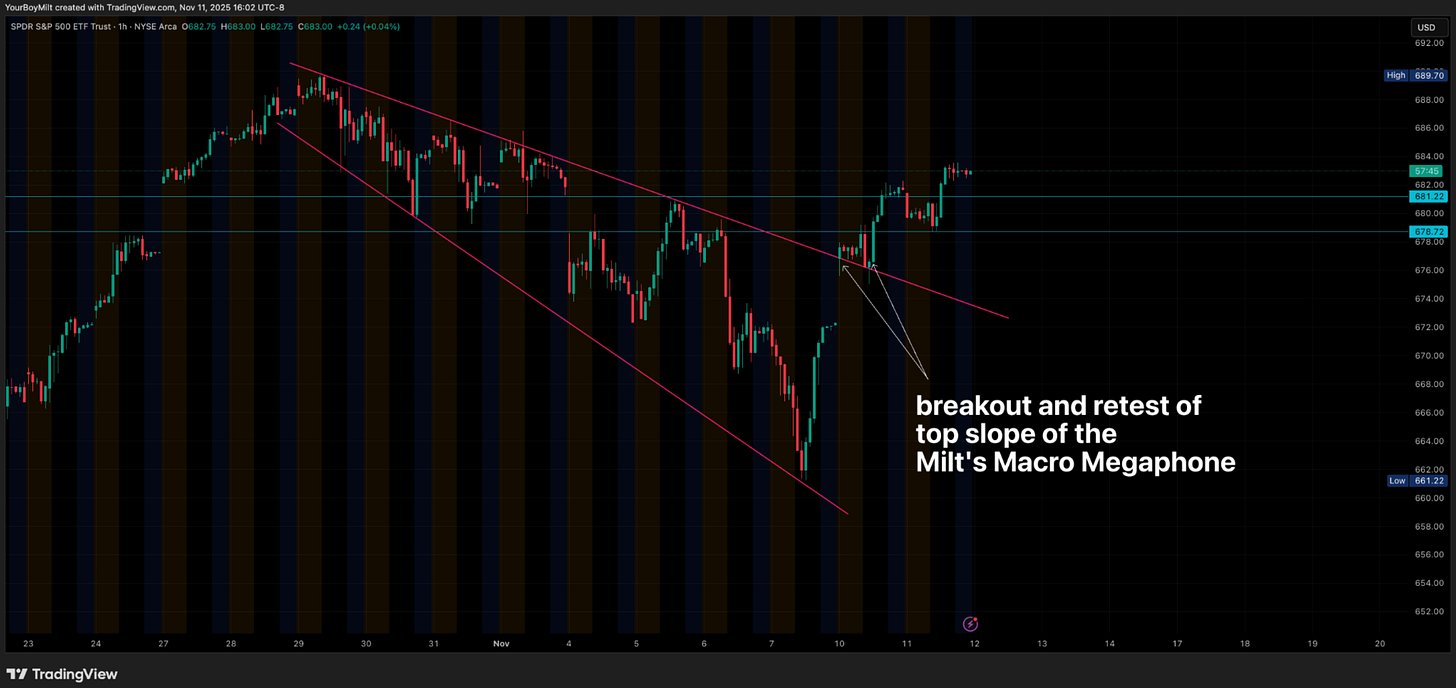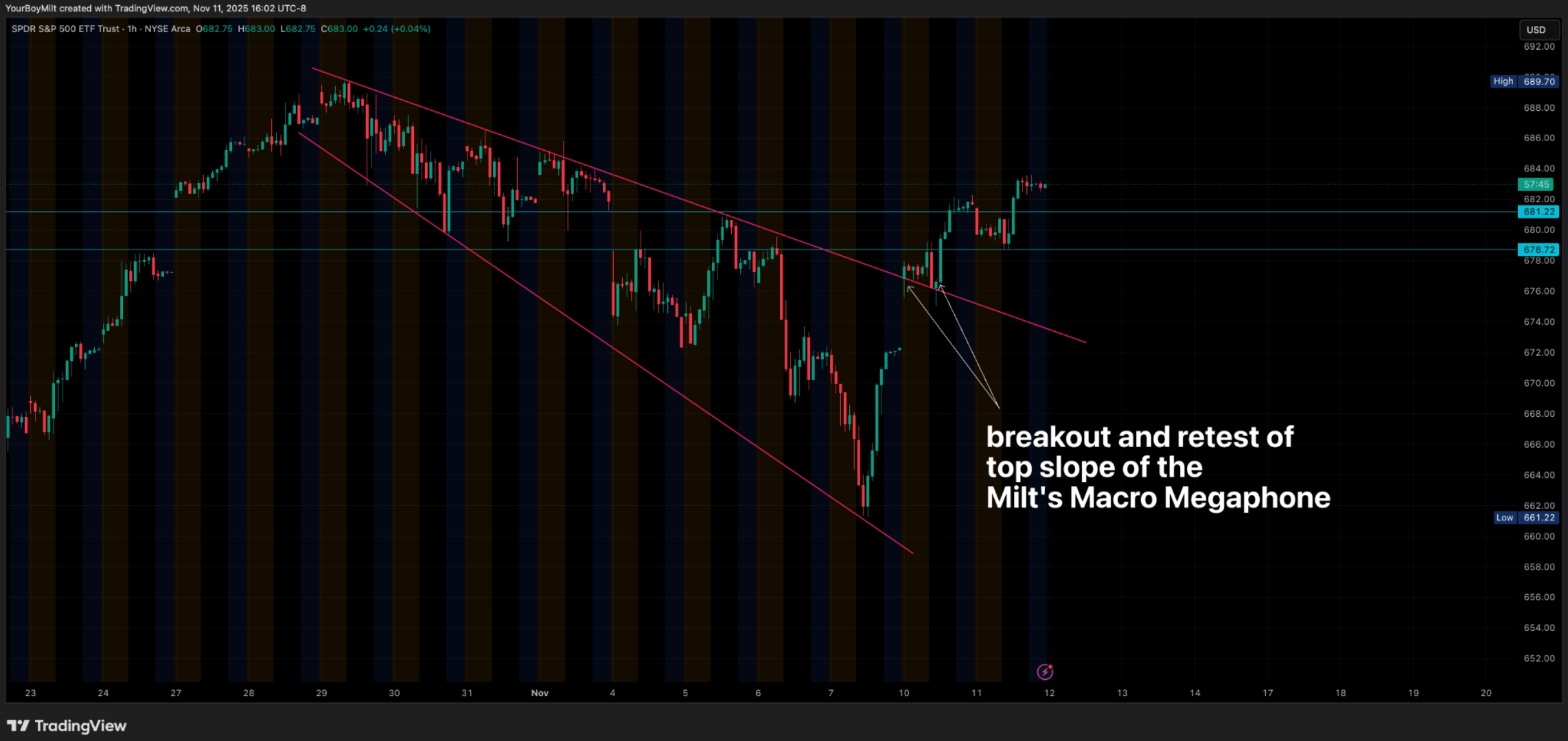 SPY broke out of a multi-week descending megaphone, retested cleanly, and launched. But…