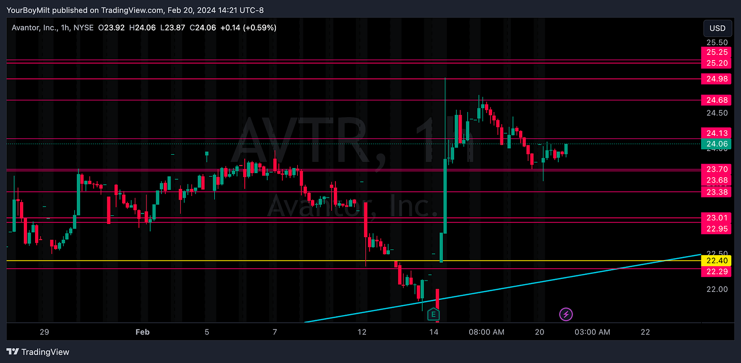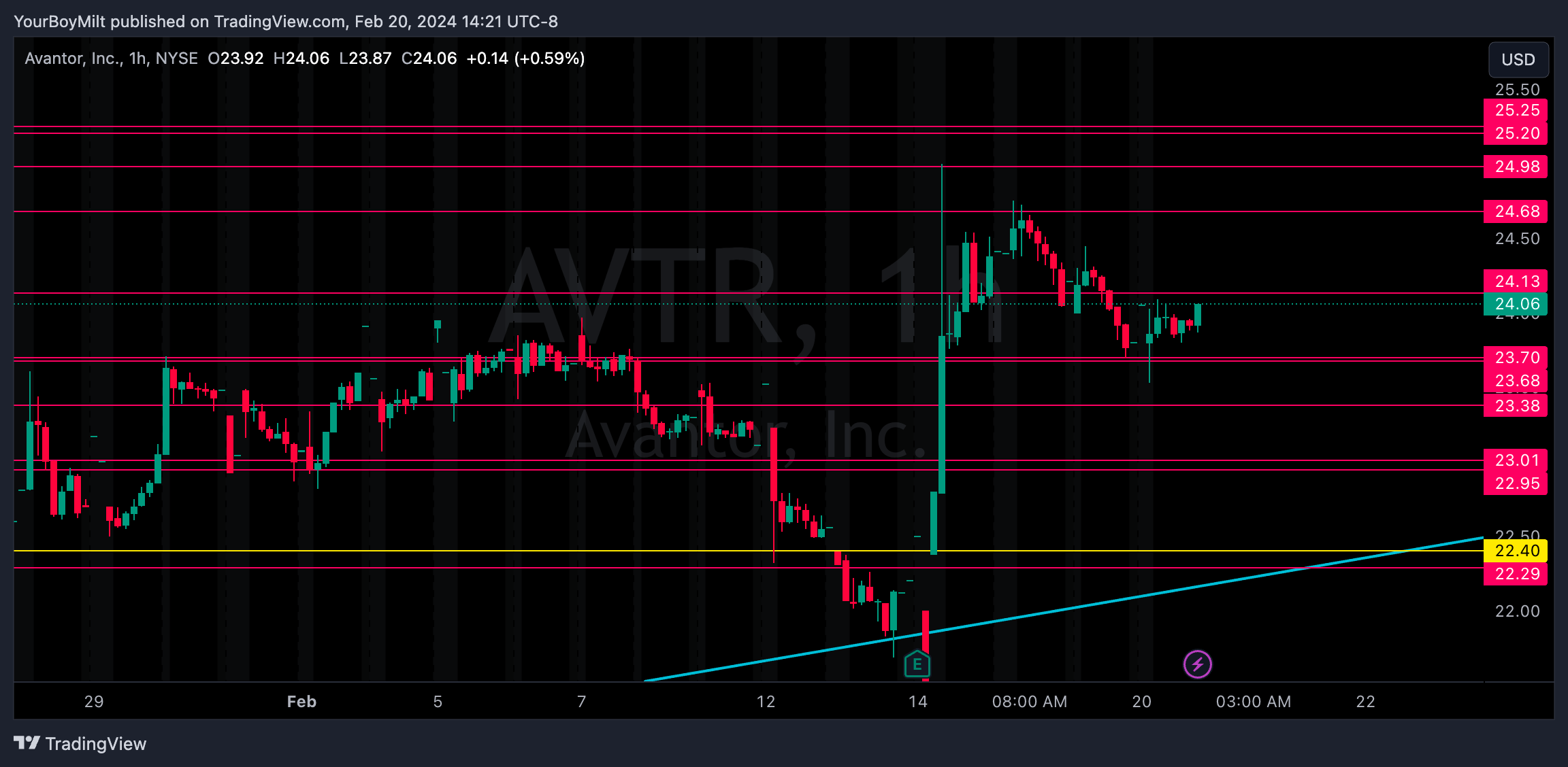 So, AVTR beautifully held support at the double monthly at 23.07, and outperformed the market today. We had concerns about the gap below, but this one looks like it’s ready to go without a backtest. We are IN on the next test of 23.7 if we are lucky enough to get it (or one of the lower supports shown here on a dump.)