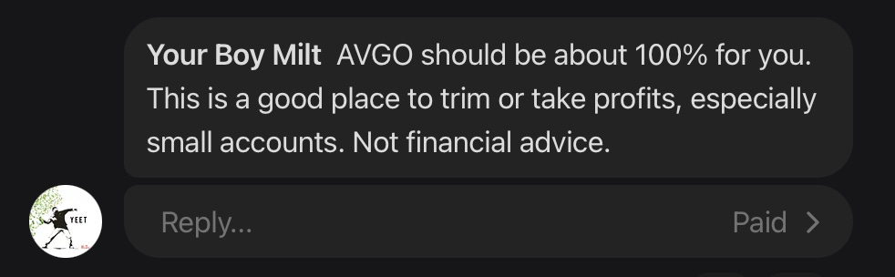 👀AVGO YOLO Filter Find Goes 100% in One Hour Off the Open— be sure to have your Substack notifications turned on for these sorts of messages where we gave the exit.