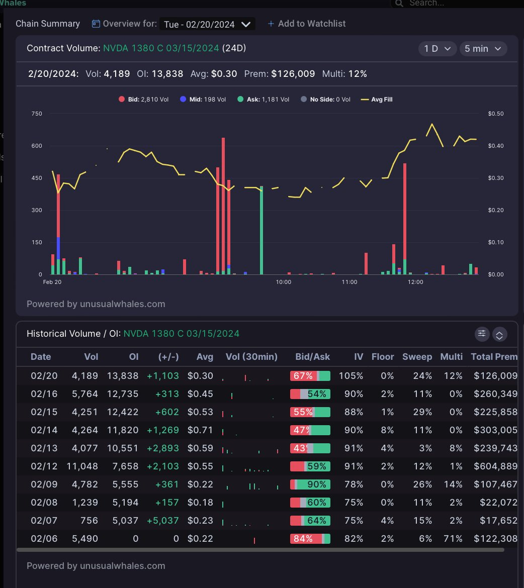 🐂One was the 1300c 2/23, and the other was the 1380c 3/15. If you look at the ridiculous volume on those contracts over repeated days…that’s the volume of whales building into a position. Earnings are ALWAYS a crap shoot, so we never, ya know, promote playing ER or play them ourselves 😉.