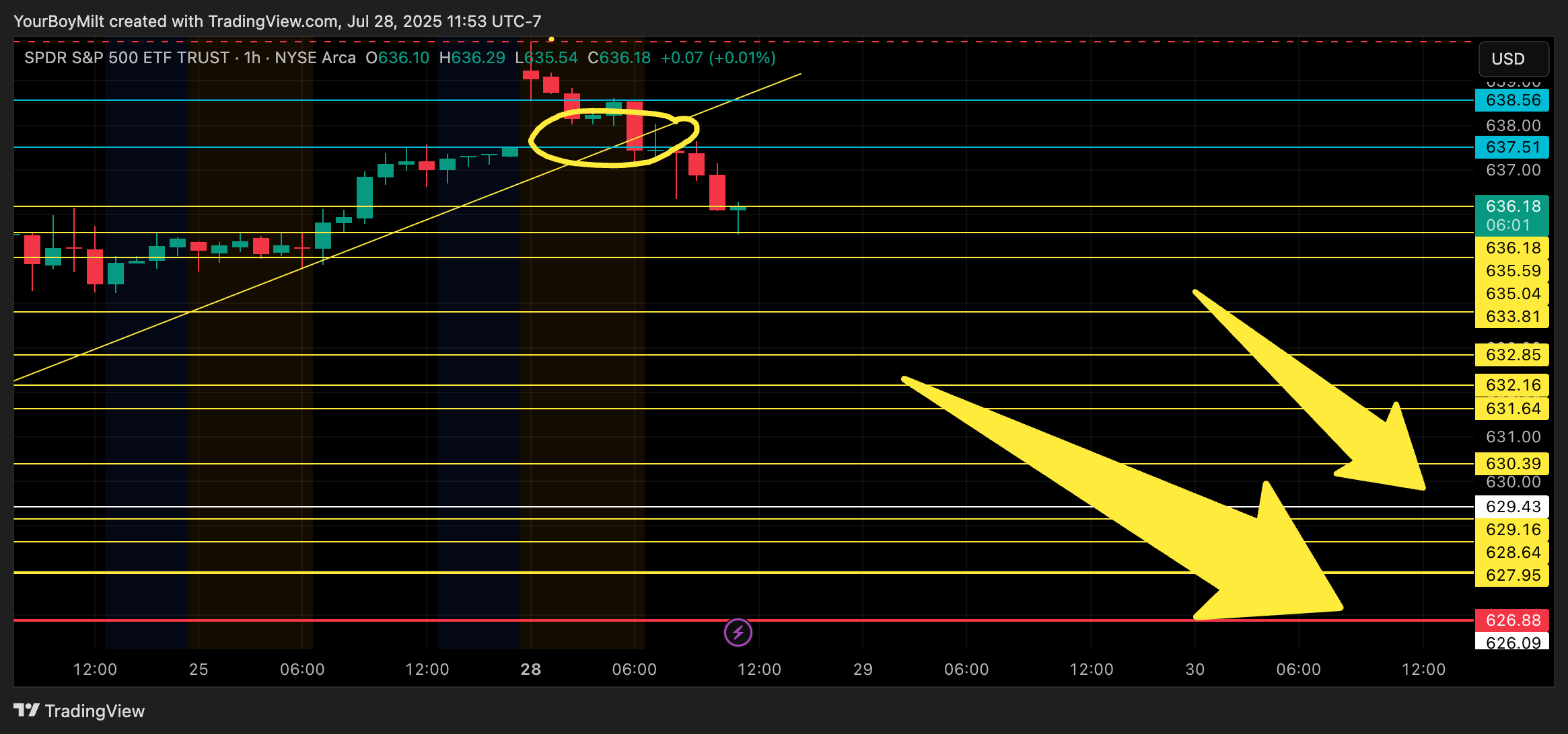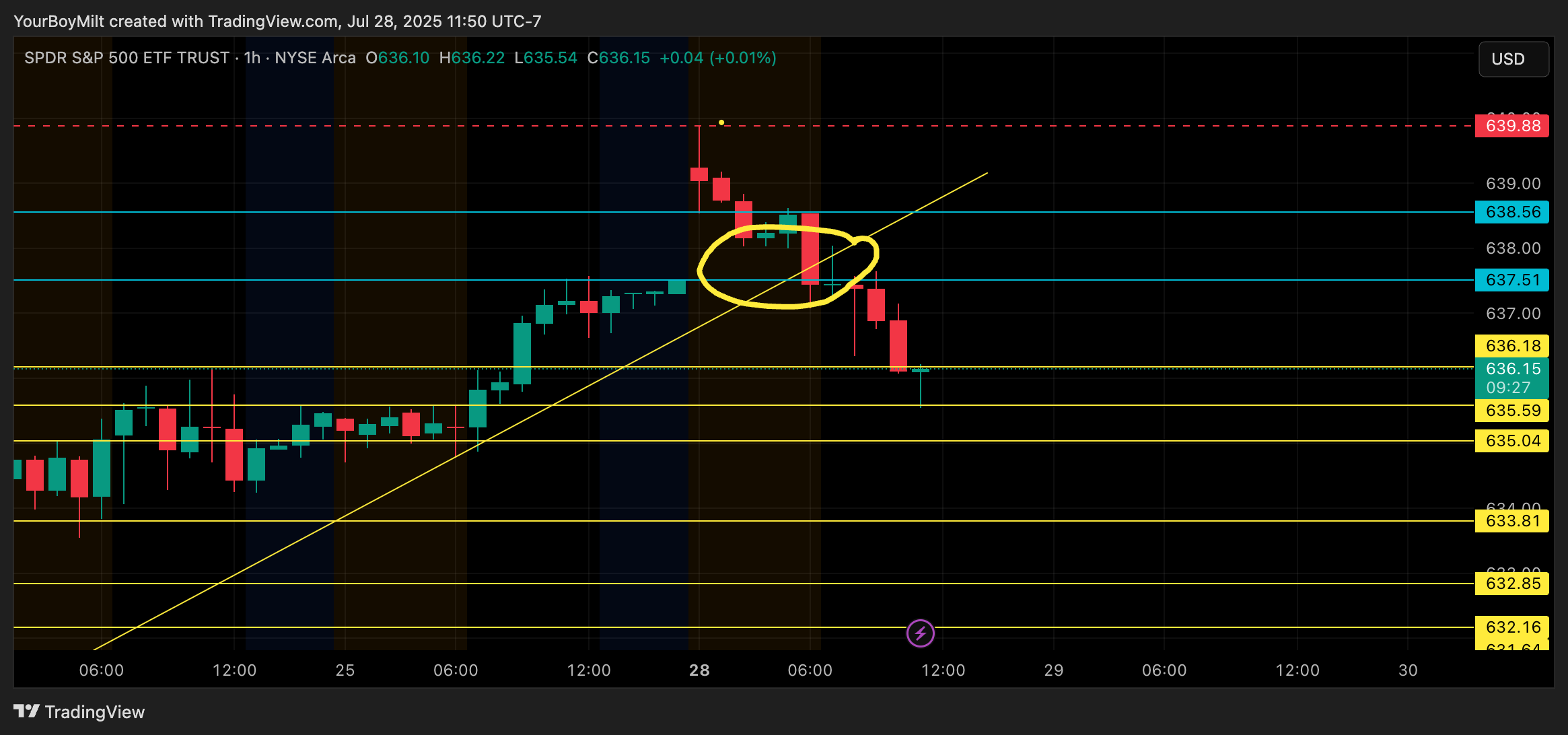 MUTUMBO LEVEL TRIFECTA REJECTION: This is big—not only did SPY break the hourly uptrend we were following—but it rejected that trendline and closed beneath the level (blue). Finally—multiple confluence clearance for a bit of backtesting.