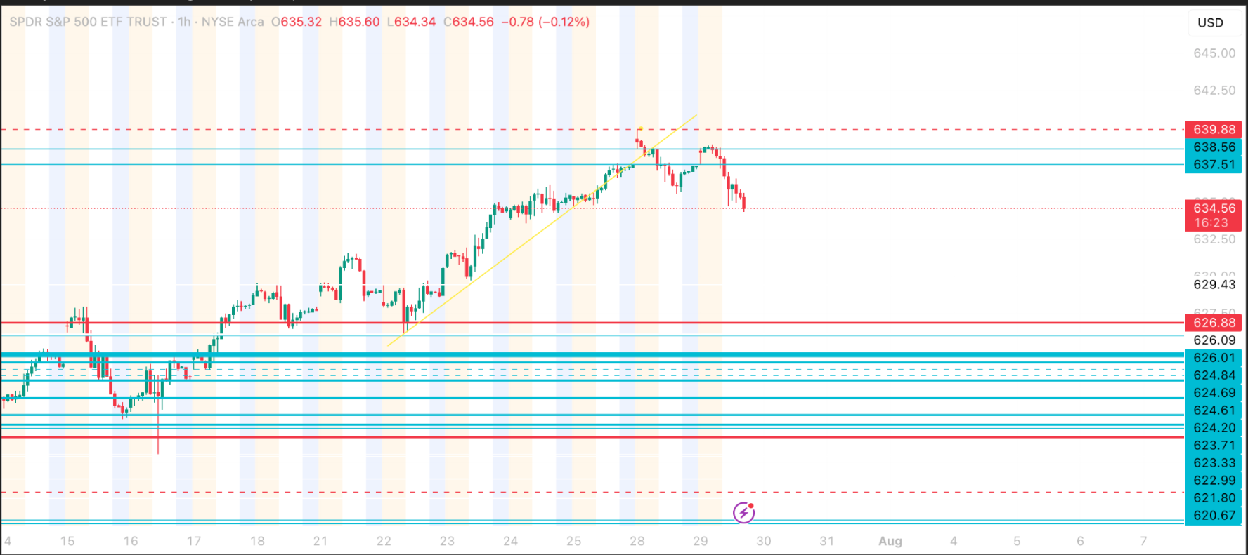 Bounce setups likely in the 626–624 zone, but if those fail, you’re looking at deeper washouts.