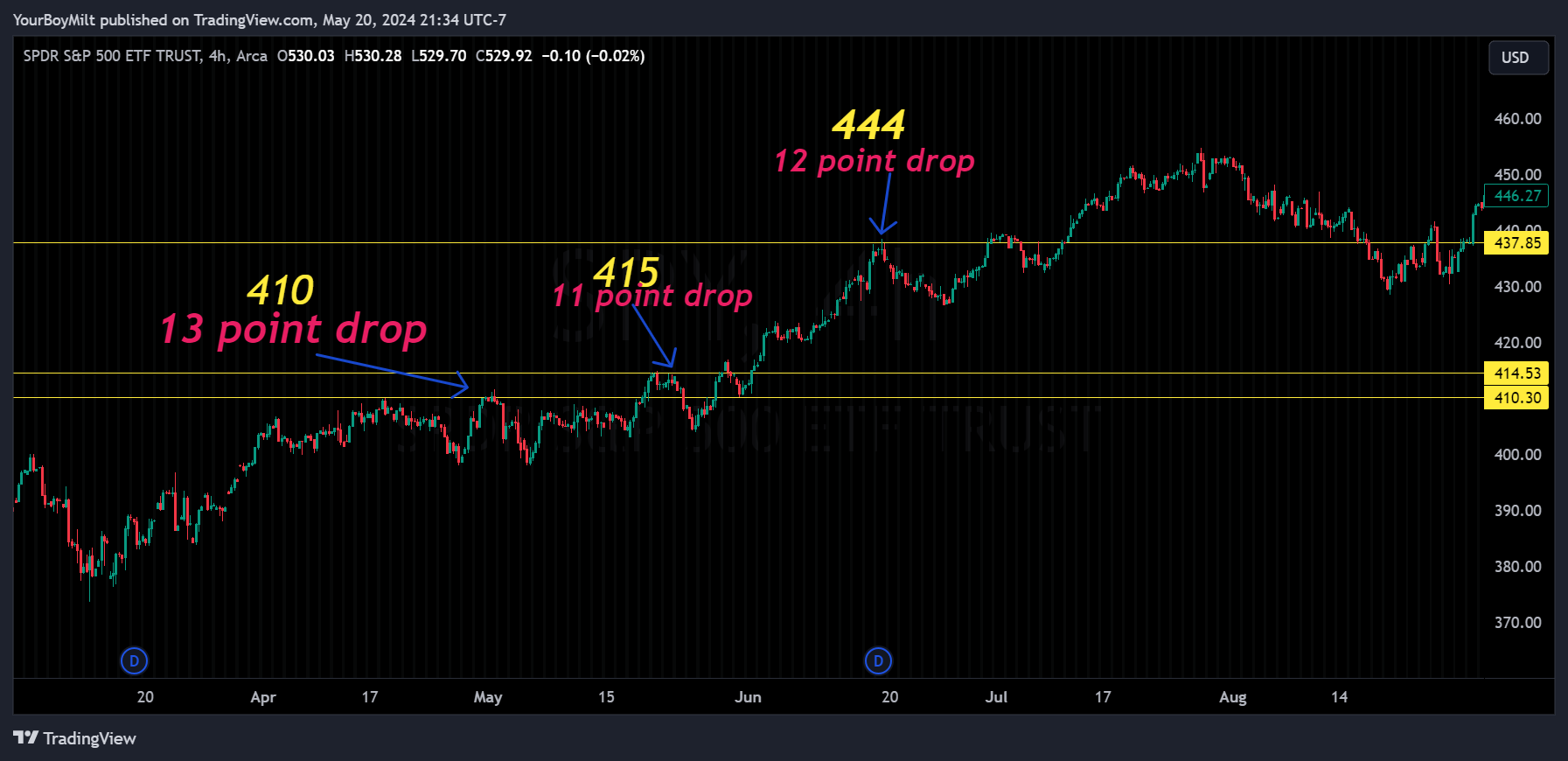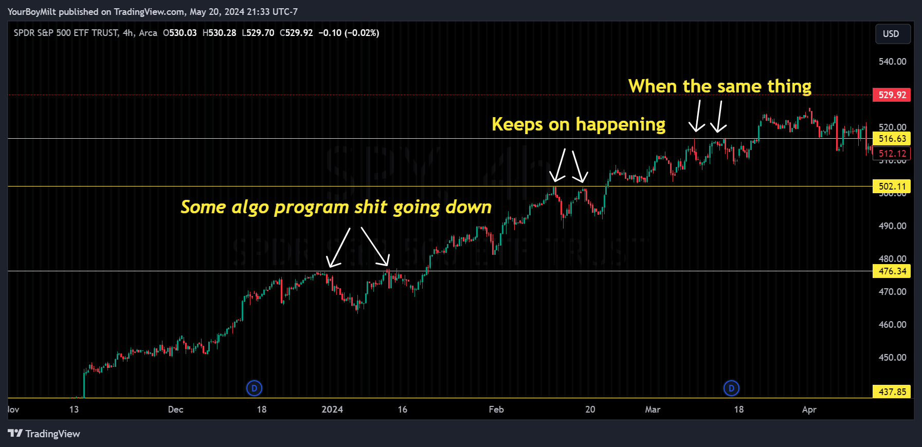 Iâll spare you the boring partâfiguring out the time frames that worked, cross-references with data drops, blah blah. The gist of it is when itâs time for SPY to drown, it doesnât. It gives two large gasps at the surface, finds itâs footing at the price action level about 11 points beneath, then flies out on fire like a glorious, call-carrying Phoenix of a dolphin.