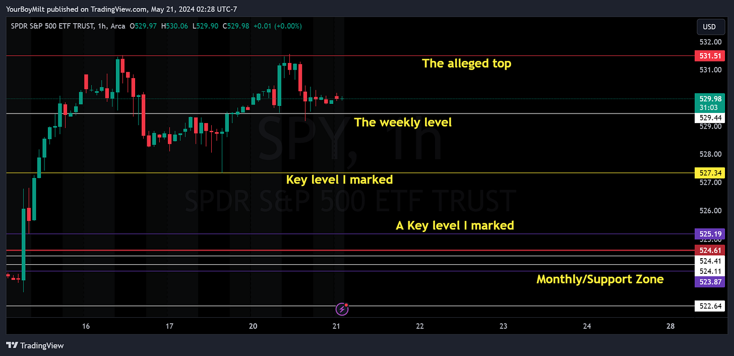 If the local top holds true, then weâre looking at a visit of the (red) 524.6 monthly level firstâtheyâve got to break this (white) weekly level that showed strength EOD. Between all time high and 524.5 we have a strong wick buy level and a gap level.