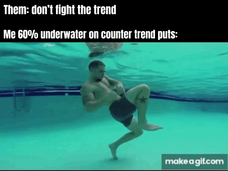Sometimes when SPY is beginning the descent of a significant backtest, it too will show similar fight against the inevitable drowning of the market. As SPY moves downward in a series of lower highs and lower lowsâa hallmark of Price Action submissionâit jolts in bullish bursts like random thrashes of fight. Green candles burst and wick above and below the downtrend, like the frenzied arms of our soon-to-be-dead friend clawing to get back on the boat.