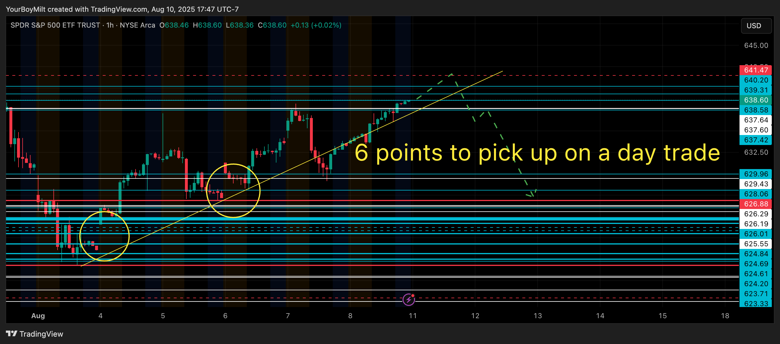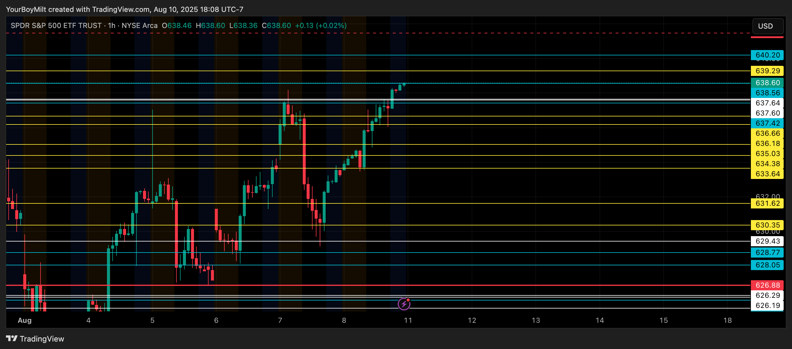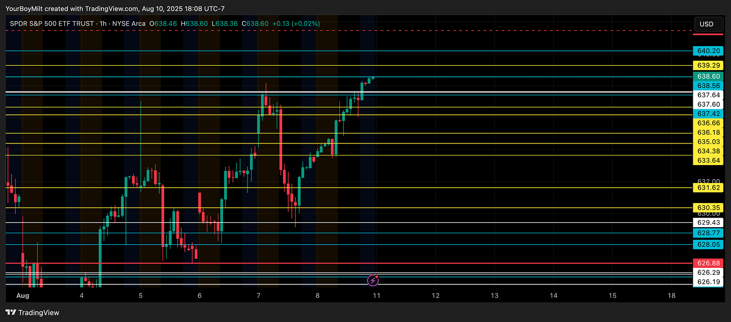 Best Trade Available: Patiently wait for the loss of 637.4 with a confirmed hourly rejection, then pick up a SPY 535p with one to two days expiration and target 630, with runners for the 628.06 gap fill still open.