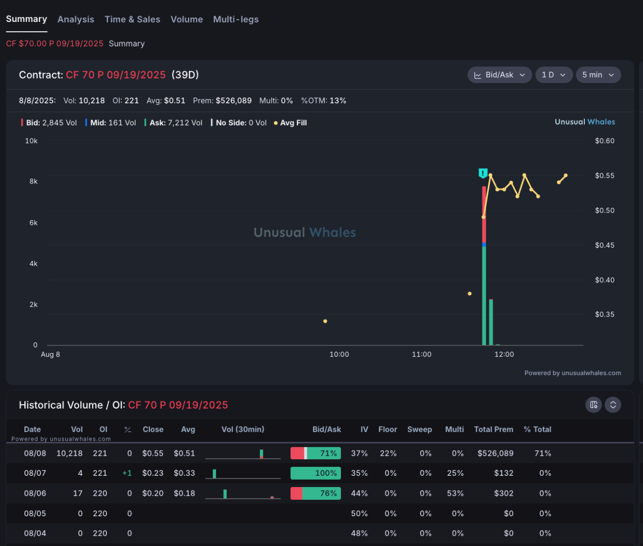 Total Volume (8/8/2025): 10,218 contracts