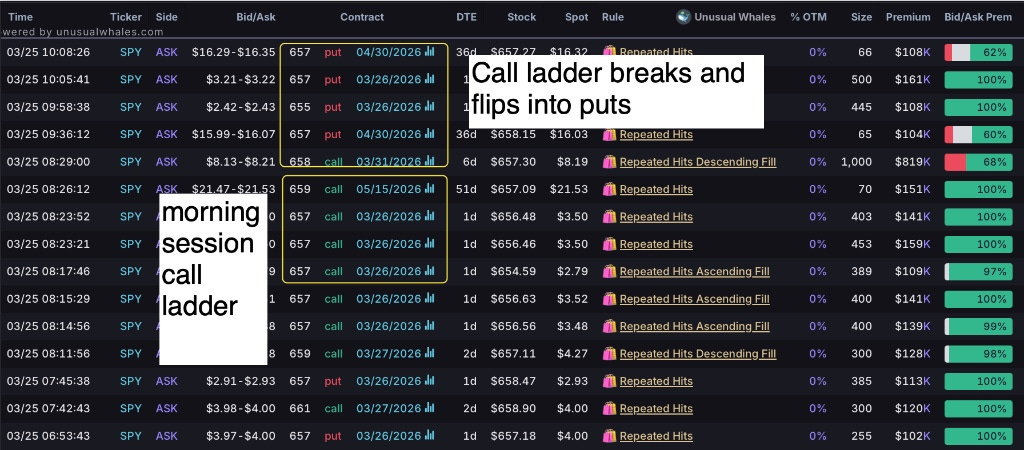 In the morning session, we saw a classic upside call ladder forming. However, the data shows that ladder has officially broken. As you can see in the charts, the flow didnât just stop; it flipped into a downside put stack.