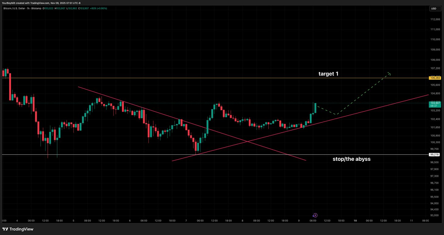 BTC cleared a multi-day downtrend and is now respecting the rising support channel — a clean stair-step setup to that first upside target.