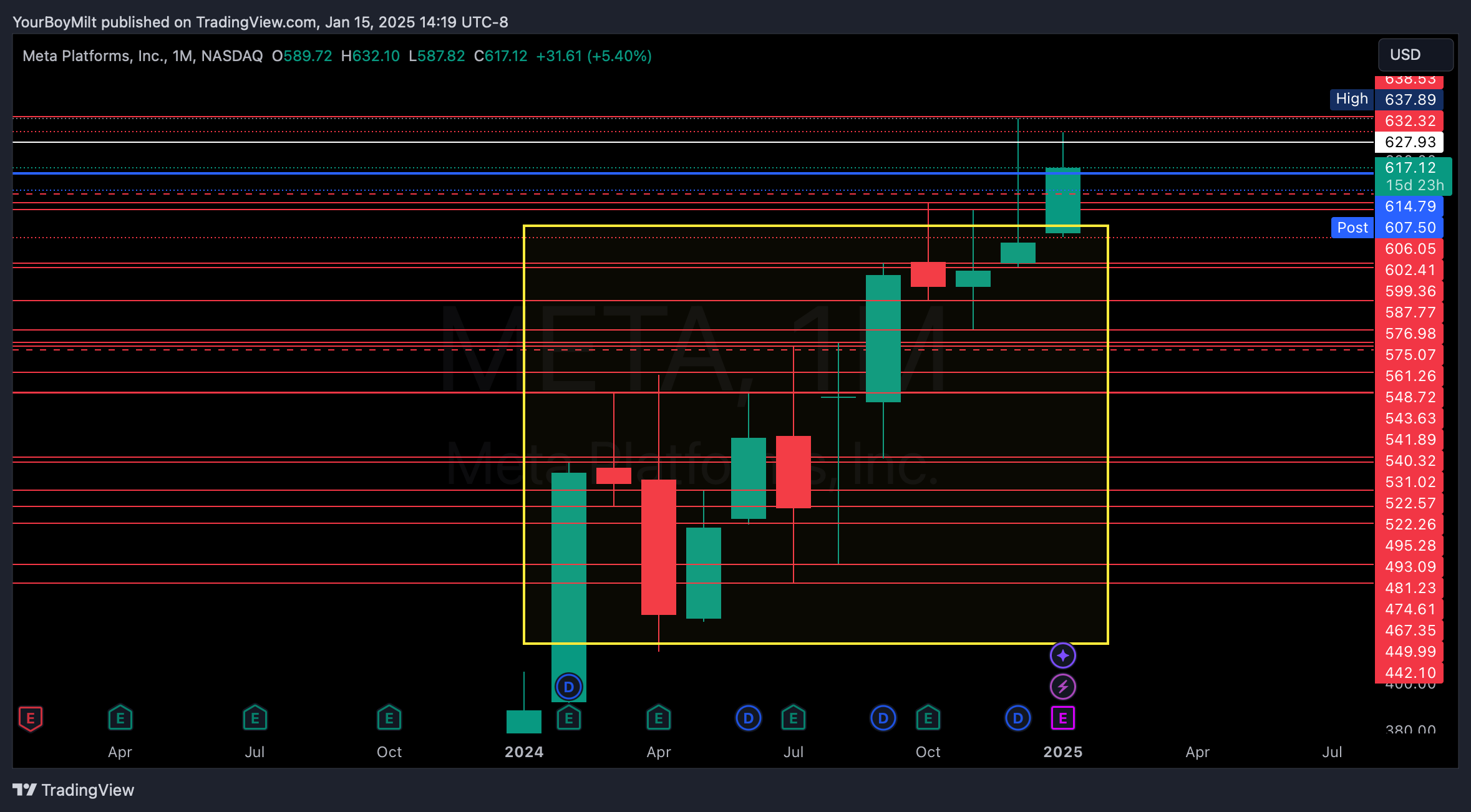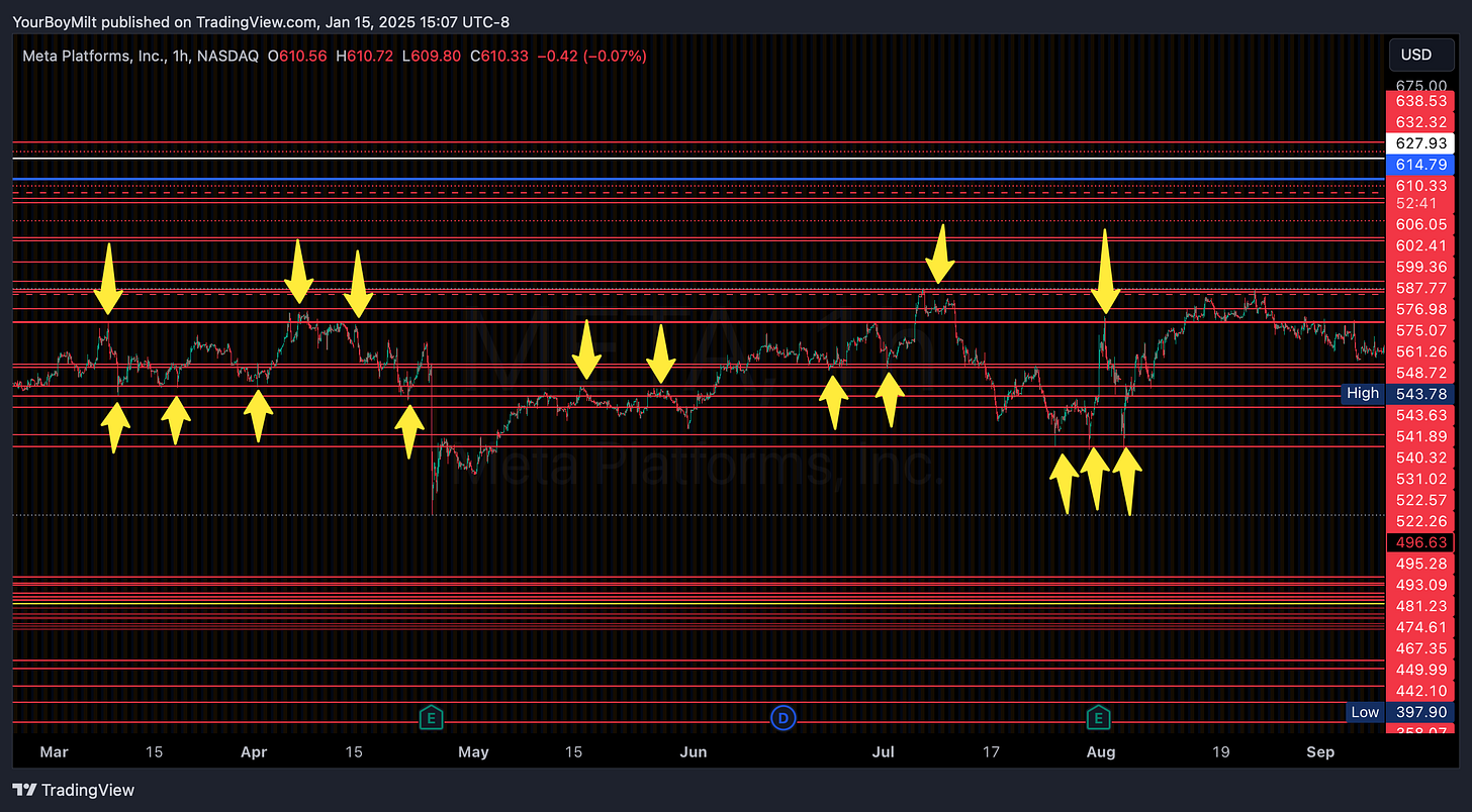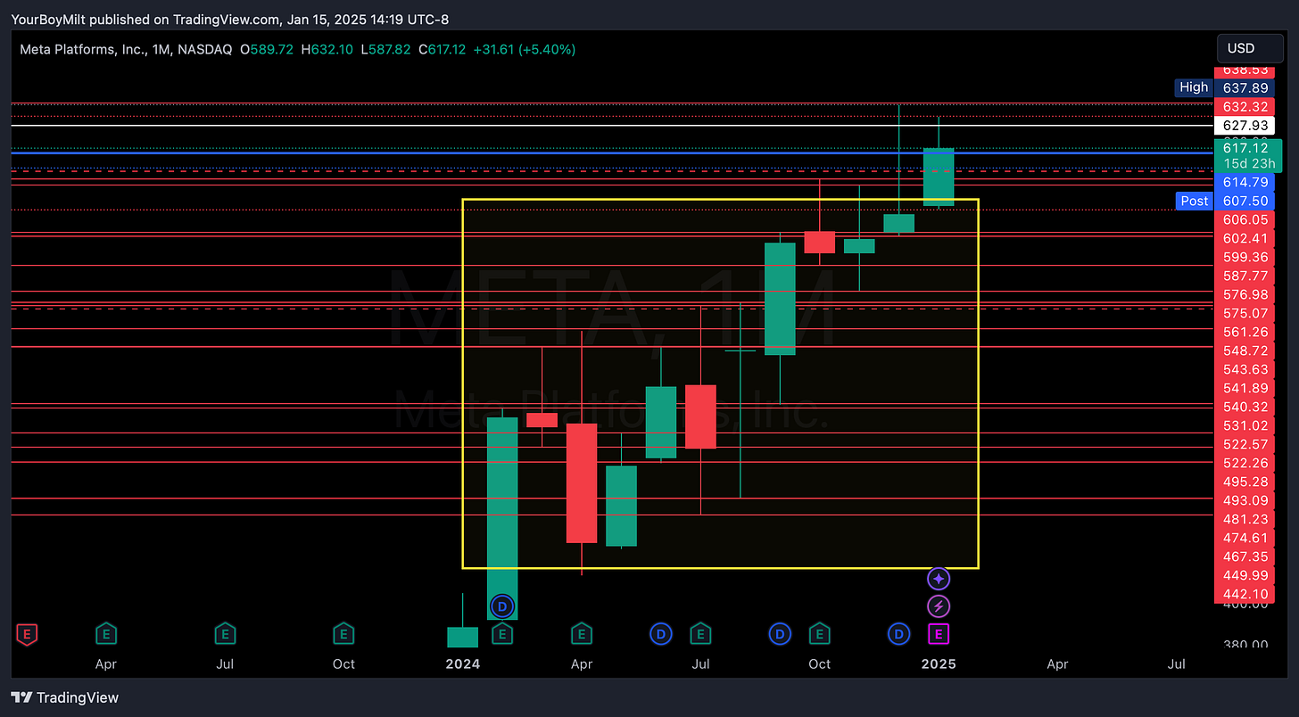 For example—here is META on the monthly chart, with monthly levels marked RED.