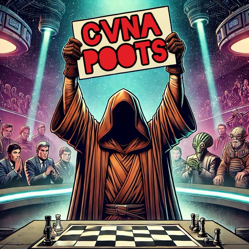 Because of the backtest levels we skipped along the way. Great Intergalactic 4D Chess (trading) is about weighing multiple probabilities at once, and playing those statistics in your favor. Therefore the odds are that—if those CVNA put whales are right—
