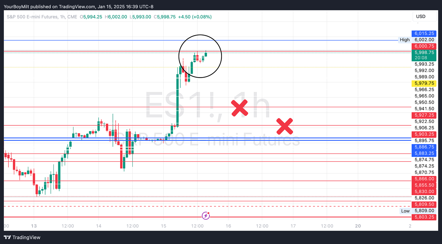 Price Action will back up their move overnight or early session tomorrow with a reversal at 6,000 that brings a backtest down to 5903 (marked with X’s in the above images.